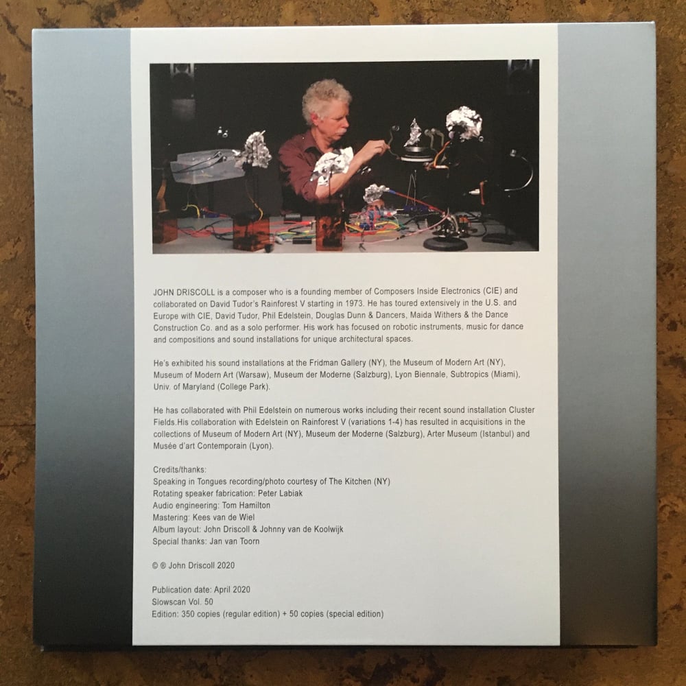 Driscoll has collaborated with Phil Edelstein on numerous works including their recent sound installation Cluster Fields.His collaboration with Edelstein on Rainforest V (variations 1-4) has resulted in acquisitions in the collections of Museum of Modern Art (NY), Museum der Moderne (Salzburg), Arter Museum (Istanbul) and Musée d'art Contemporain (Lyon). For the first time on vinyl, this essential publication includes 4 key audio works spanning an era from 1979 to 2018. Edition of 350."